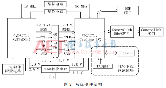 随着电子技术的进步,图像处理系统得到了飞速的发展。当今的主流图像处理平台大多基于FPGA+DSP[1],虽然满足系统实时性及处理性能要求,但系统结构复杂,设计难度较高,资源浪费严重,不利于小型化设计。针对这一问题,本文设计了一种基于FPGA和CMOS成像处理系统,CMOS传感器采集图像信息经由FPGA实现基本的图像处理算法后,同时输出两路不同数据格式的图像信号供后续处理控制系统使用或者直接显示,如Cameralink、DSP、VGA等。本系统将CMOS和FPGA合成为一个小型化的完整成像系统,成本低廉,适用范围广,可直接装载常用的图像处理算法并实时显示输出[2];在面对复杂的算法或测控应用时,也可灵活地外接DSP或其他测控平台,相较传统图像处理系统更灵活、更节省资源、更具有应用优势。