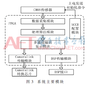 本系统设计目的主要是实时采集、处理并显示CMOS图像数据。功能模块主要划分为如图3所示的CMOS配置及数据采集模块、图像处理算法模块和多通道输出显示模块。