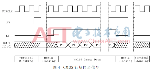 配置CMOS输出分辨率为1 024×768、帧率为60 Hz的视频图像,其像素时钟、行场同步信号和有效数据之间的关系如图4所示。在场同步信号有效的前提下,图像采集模块以行同步信号上升沿为采集起点,高电平有效期间为采集状态。