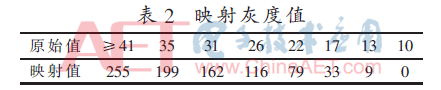 每帧图像场消隐期间,利用当帧统计的图像灰度值映射参数,根据式(1)~式(4)所示灰度映射公式进行全灰度级的映射计算。表1所示为对一帧图像统计的最大值、最小值及均值。为了剔除噪点及坏点的影响,本系统记录图像的多级最大值(即最大值和多个次大值)以及其相对应的像素数,采用像素数大于10 个像素的灰度最大值作为当帧图像的线列出了部分灰度值的映射结果。