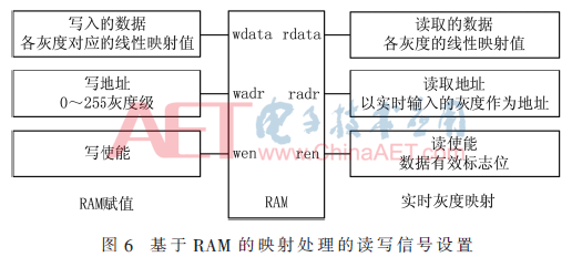 将计算结果以原始灰度值为地址存入基于IP核构建的双口RAM中,如图6所示,下一帧图像有效数据期间,以实时灰度值为地址从RAM中取出其对应的映射值输出即可。由于算法处理部分在帧间消隐期间完成,相对于输入图像数据流,经过分段线性映射处理的图像仅延迟2个时钟周期的RAM读取时间,灵活利用了帧间消隐时间,提高了系统图像输出的实时性。