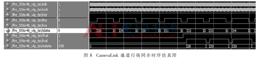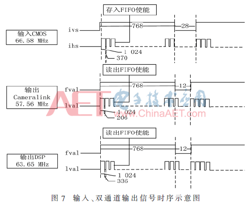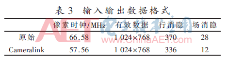 图7为双通道Cameralink和DSP数据格式转换前后时序对比图,两通道实时并行输出,以Cameralink显示为例,转换前后数据格式如表3所示。